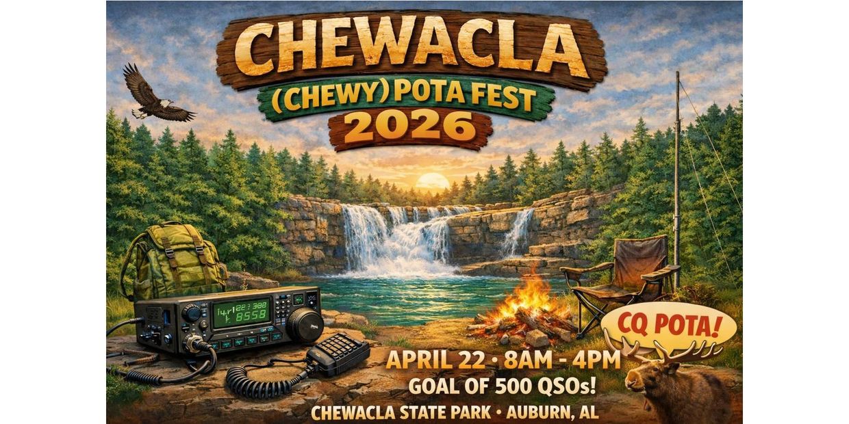 The POTA FEST 2026 special event at Chewacla State Park (US-1038), initiated by Adam – WV4F and Bobby – N0Ozz and supported by several of our members, was a terrific success. Open the link below to see a very informative article with map and data reflecting the actual outcome of the event. We think POTA FEST should become an annual event. Let’s discuss this Thursday evening!