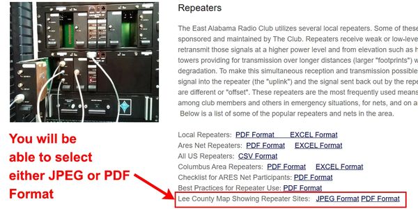 Repeater locations and associated information are now available on a custom Google Map at THIS LINK. Also, a printable map that shows the relative locations of the repeaters in Lee County is available in JPEG and PDF formats. Links for these maps can be found near the top of the Repeaters and Nets Page of this website.